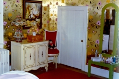 The interiors of the movie house were filmed on a set, which may be why the quality of the light is what it is. Everything seems worn and in need of repair, unlike the real house, but is a nice stylistic touch. In the children’s bedrooms and the “sewing room” the wallpaper is shown as half-peeled off, a nod to the post-muder clean up that must have occurred. The furniture is spare and well-used, a subtle detail to illustrate that the family is out of their depth financially. The book takes place during the winter, and the movie doesn’t specify when it takes place, but George feeling cold is a major plot point. The exteriors seem to show early fall and the weather doesn’t look particularly cool, but the house effectively gives the impression of being persistently chilly. Cold spots in houses have long been associated with hauntings, although I suspect what influenced Jay Anson (and possibly George Lutz) was the description of the nursery in The Haunting of Hill House by Shirley Jackson (1959). It’s described as the “heart of the house,” the center of the haunting, and the location of a dramatic cold spot.