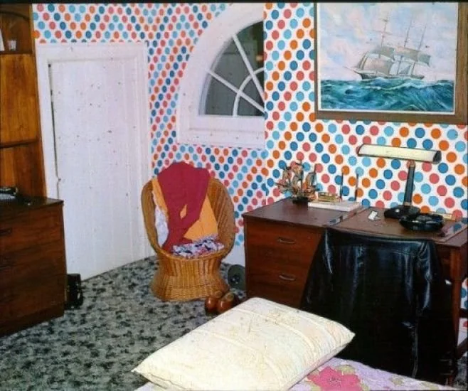 The Amityville Horror, released in 1979, has the grim and dreary earth tone palette that seems common in the movies and photography of the late ‘70s, including the interior of the house. Interestingly, this is in direct contrast to what the real house looked like, something I found out while looking at the DeFeo crime scene photos (below). The house in Amityville was smaller and much more ostentatious than the movie version - it looked like an Italian restaurant decorated by Liberace. The family who had lived there, the DeFeos, had recently come into some amount of money and were clearly interested in broadcasting this fact to the world. The house is almost Victorian in its aesthetic, with overstuffed rooms and heavy velvet furniture and gilt-framed oil paintings. Every room has a bold wallpaper print and shag carpet and piles of possessions belonging to the four children who lived there.